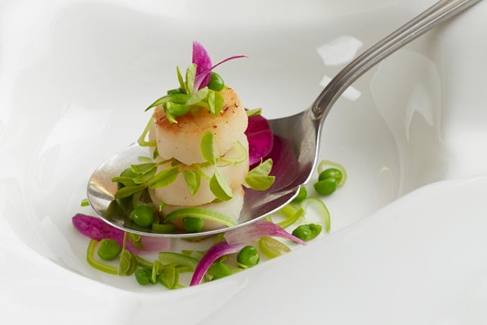 Sweet English Pea Soup with Seared Scallop and Buttered Leeks